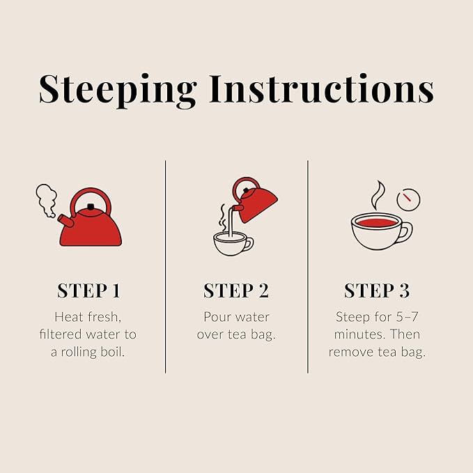 - Steeping Instructions: Steeping herbal tea is easy. Simply heat fresh, filtered water to a rolling boil. Then pour 6 oz of water over the tea bag and steep for 5-7 minutes. Serve hot or let cool and pour over ice.