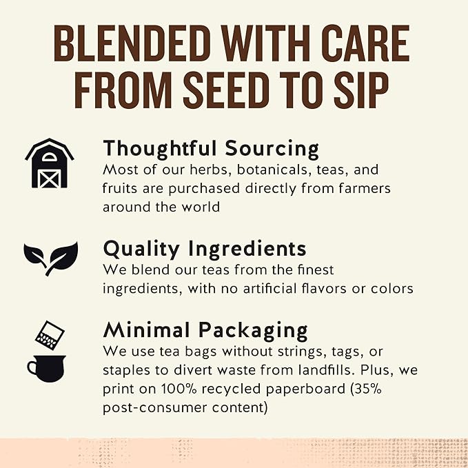 - MINIMAL PACKAGING: We use tea bags without strings, tags, or staples to divert waste from landfills. Plus, we print on 100% recycled paperboard (35% post-consumer content)