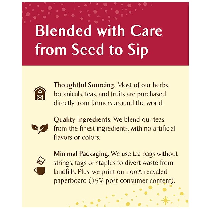 - Responsible packaging: recycled boxes; stringless tea bags help reduce waste