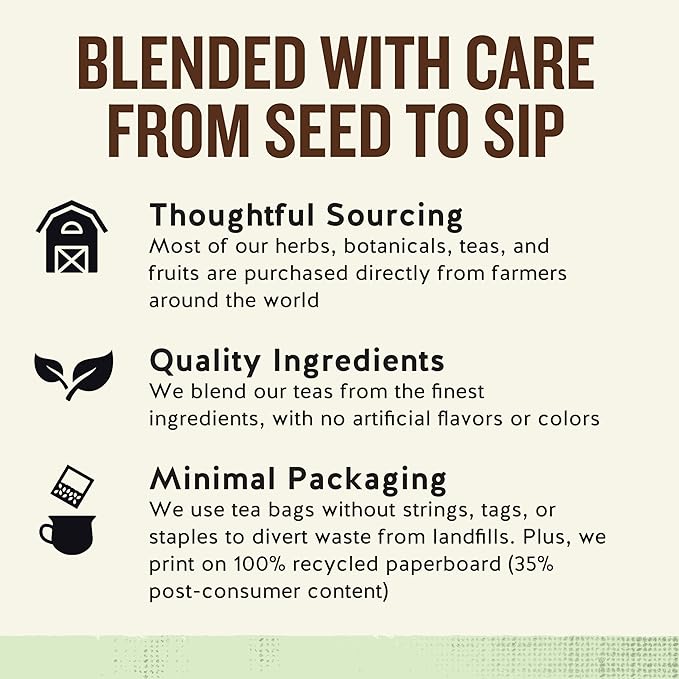 - Minimal Packaging: We use tea bags without strings, tags, or staples to divert waste from landfills. Plus, we print on 100% recycled paperboard (35% post-consumer content).