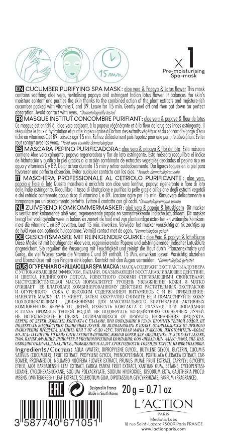 L'Action Paris Cucumber Purifying Spa Mask, Sheet Mask Balances and Purifies Skin, Enriched with Soothing Aloe Vera and Revitalising Papaya, Ideal for Tired Skin, Pack of 1