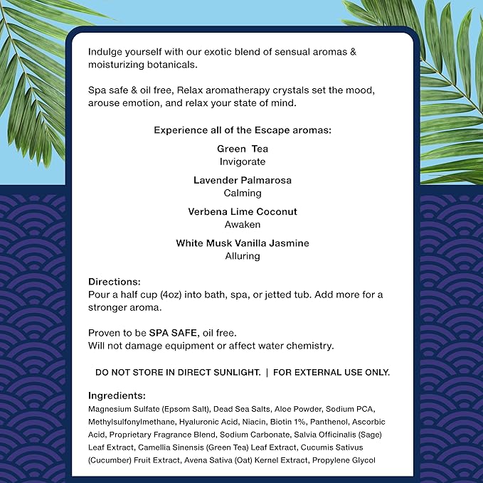 - SPA-SAFE & MADE IN THE USA WITH SECURE SEAL: Relax Spa & Bath, carefully formulated, these hot tub spa aromatherapy bath salts maintain water chemistry, it’s safe for use in hot tubs, Jacuzzis, and whirlpool baths, without affecting your spa equipment. Proudly made in the USA. In addition, designed for convenience, our PRESS-LOK closure provides a secure, intuitive seal—simply press to lock for an airtight, spill-resistant, and effortless storage solution.