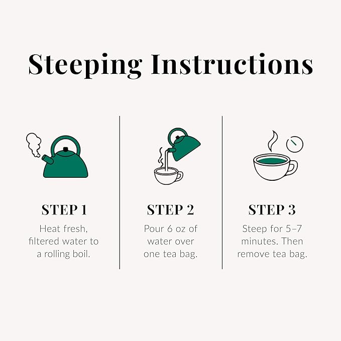 - Steeping Instructions: Simply heat fresh, filtered water to a rolling boil. Then pour 6 oz of water over a tea bag and steep for 5–7 minutes. Serve hot or let cool and pour over ice. After steeping, add the used tea bags to compost or soil — they make gardens happy.