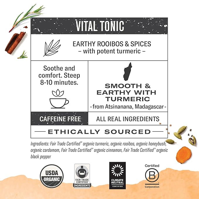- Golden Turmeric: Blended entirely with real organic ingredients this herbal teasan combines turmeric, rooibos, cardamom, vanilla and cinnamon offering mellow apple notes with a sweet peppery zest