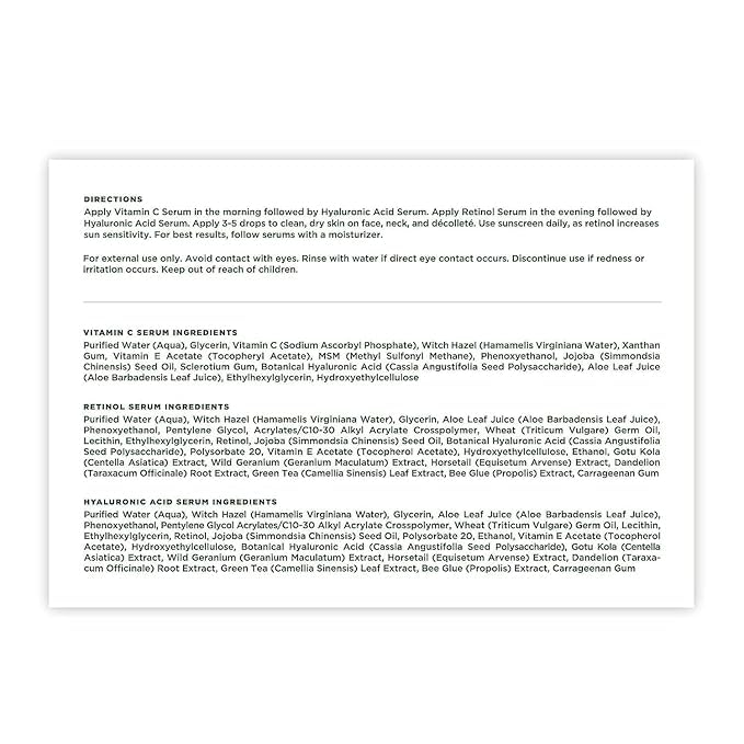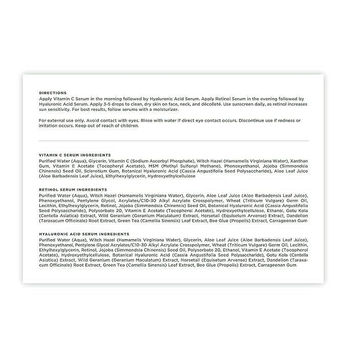 - POWERFUL ANTI-AGING TRIO: This set includes our beloved Vitamin C Serum to brighten and even skin tone, Retinol Serum to reduce fine lines and wrinkles, and Hyaluronic Acid Serum for deep hydration. Used together, these potent serums visibly improve skin texture, tone, and firmness for a more youthful complexion. Suitable for all skin types including sensitive skin. See noticeable results in as little as 2-4 weeks with consistent use.
