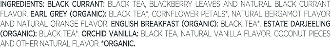 - BLACK TEA ASSORTMENT with five varieties of our most popular black tea blends - Earl Grey, English Breakfast, Estate Darjeeling, Black Currant, Orchid Vanilla.