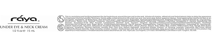 - Paraben-Free and Cruelty-Free: Rest assured, our RAYA Under-Eye & Neck Cream (408) is paraben-free, cruelty-free, and proudly made in the USA. It contains organic ingredients, ensuring a secure and efficient anti-aging treatment.