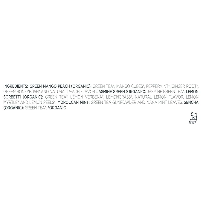 - ORGANIC GREEN TEA SAMPLER with five varieties of the world's finest green tea blends - Green Mango Peach, Jasmine Green, Moroccan Mint, Lemon Sorbetti, Sencha.