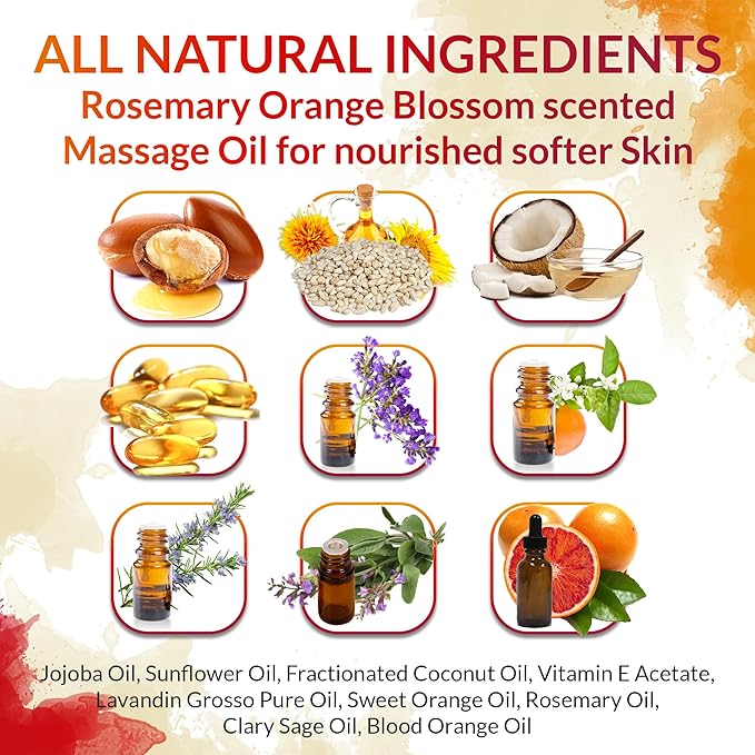 - LUXURIOUS ORANGE BLOSSOM AND ROSEMARY AROMA WITH QUICK ABSORBING FORMULA: Revel in the refined and invigorating scent of orange blossom paired with rosemary in our luxurious oil for body massage. Crafted for a non-greasy, swift-absorbing application, it's ideal for massage therapy, leaving no residue behind. This formula ensures a smooth, comfortable massage experience that caters to all skin types, from oily to sensitive.