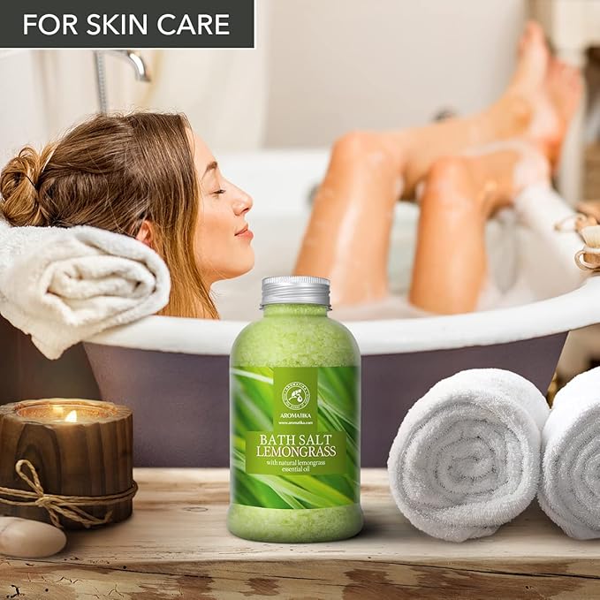 - BATH SEA SALT LEMONGRASS with natural Lemongrass essential oil - great relaxation, calm and good mood, best benefits for women, men and kids.