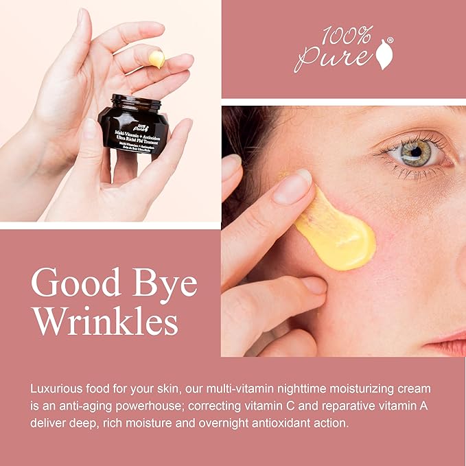 100% PURE Multi-Vitamin + Antioxidants Ultra Riche PM Treatment Skin Renewing Night Cream Vitamin C & Retinol Facial Moisturizer, Powerful Anti-Aging Moisture Replenishment - 1.5 oz