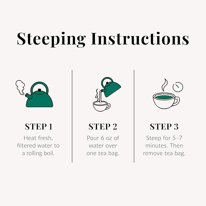 - STEEPING INSTRUCTIONS: Simply heat fresh, filtered water to a rolling boil. Then pour 6 oz of water over a tea bag and steep for 5–7 minutes. Serve hot or let cool and pour over ice. After steeping, add the used tea bags to compost or soil — they make gardens happy.