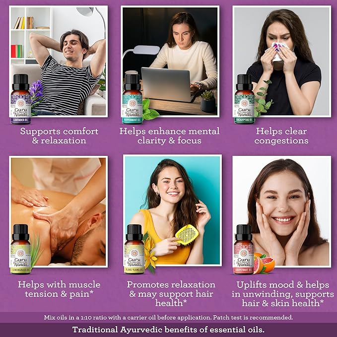 - GURUNANDA SET OF TOP 6 ESSENTIAL OILS: Elevate your mood with our 6 (variety of scents) most popular essential oils of 10ml each- Lavender, Peppermint, Eucalyptus, Lemongrass, Grapefruit & Ylang Ylang packed in amber bottles with leak-proof caps.
