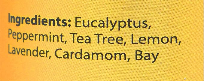 - Ingredients : Eucalyptus, Peppermint, Tea Tree, Lemon, Lavender, Cardamom and Bay. All our oils are Pure, Natural, Undiluted, Non-additives, Non-fillers, Non-synthetics, GMO-free, Best for Aromatherapy & Scents
