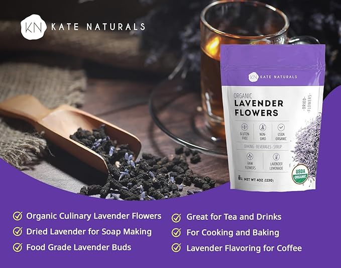 Kate Naturals Dried Lavender Flowers for Tea, Syrup, Lemonade, Soap Making. Edible Culinary Grade Buds (4oz, Organic, Food Grade)