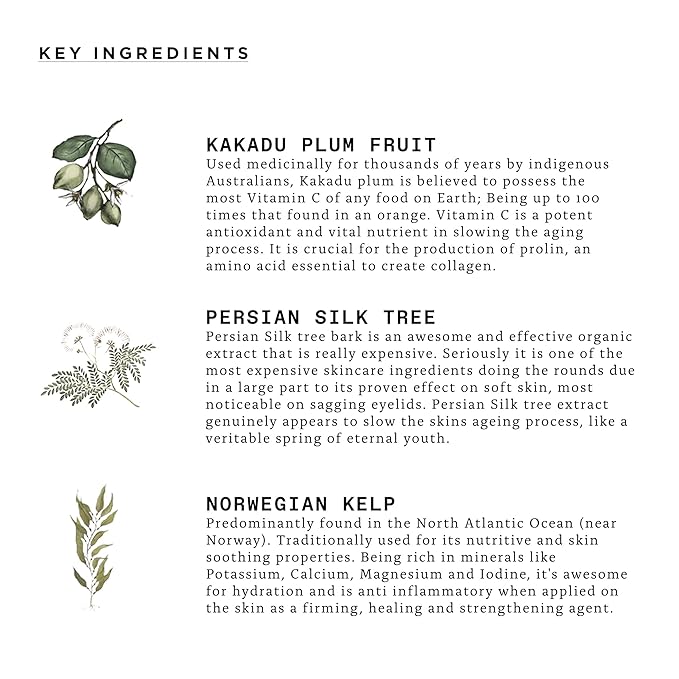- 97% Natural Based Ingredients - Kakadu Plum Fruit Extract, Norwegian Kelp, Persian Silk Tree, Swamp Maple Bark Extract, Horopito, Rosemary Extract to name a few!
