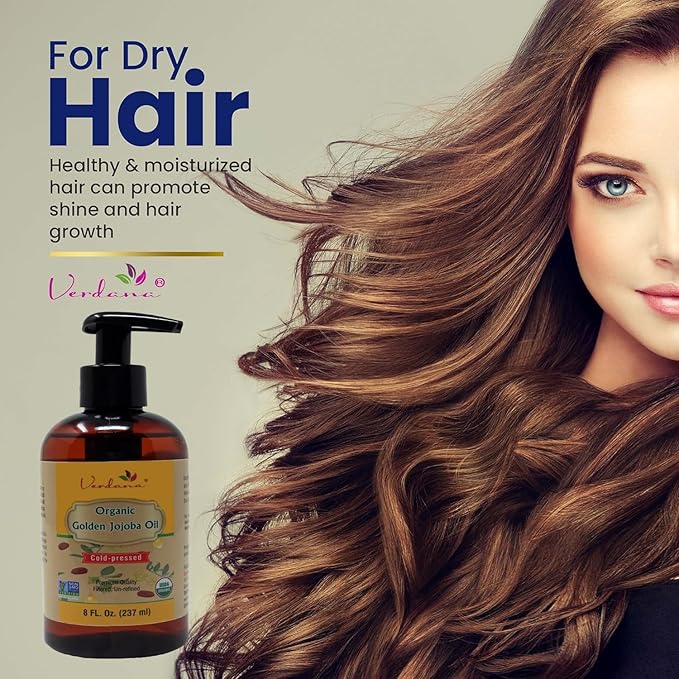 Verdana Organic Golden Jojoba Oil – 8 fl oz with Pump - USDA, Non-GMO - Cold Pressed, Unrefined, Hexane Free - Bulk, Moisturizing Oil for Skin, Body, Face, Hair, Scalp, Nails and Cuticles