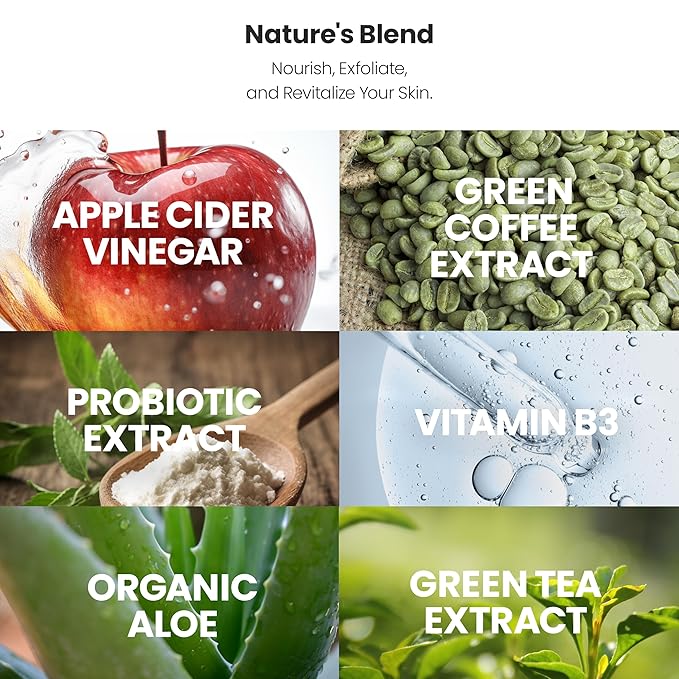 - Naturally-Derived Skincare Formula: Nourishing moisturizer blended with PURE ACV, Organic Aloe Vera, Probiotic extract, Avocado Oil, African Green Coffee Extract, Vitamin B3, Green Tea & Chamomile.