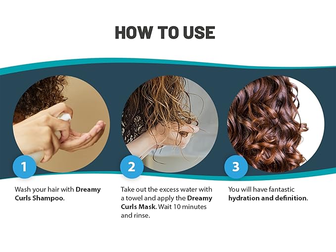 - 【HOW TO USE】Wash your hair with Dreamy Curls Shampoo, take out the excess water with a towel and apply the Dreamy Curls Mask. Wait 10 minutes and rinse. The hydration and definition of your curls will be noticeable.