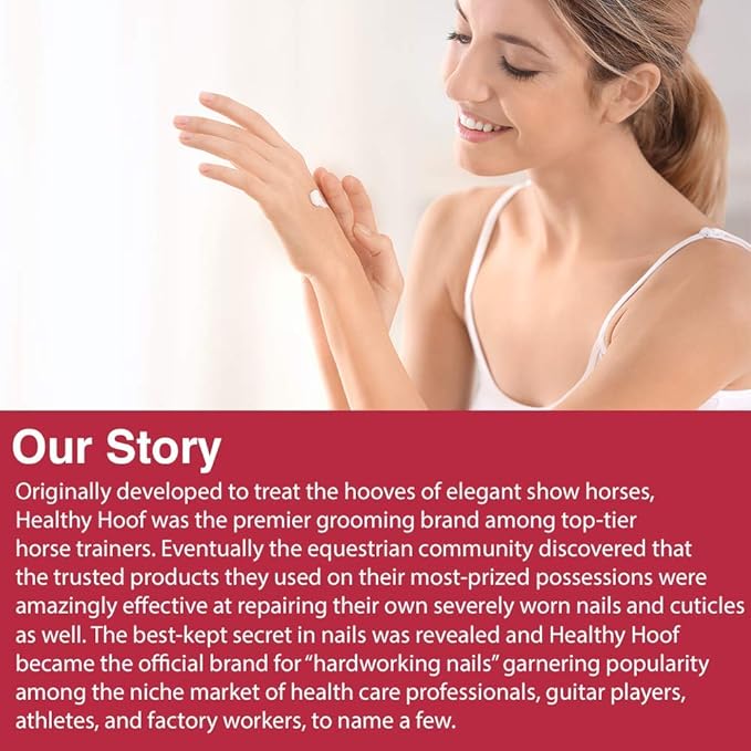 - FORMULATED BY HEALTHY HOOF, THE TRAINER’S CHOICE: Healthy Hoof is the premier grooming brand among top-tier horse trainers. Originally developed for effective repair of hardworking nails and to treat the hooves of elegant show horses. This original equestrian formula is used by horse trainers and was amazingly effective at repairing even their own severely worn nails and cuticles! With the world-renowned Healthy Hoof, experience unrivaled conditioning therapy for nails, hands, and feet!