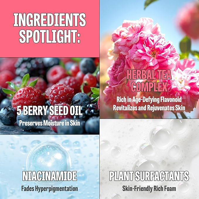 - SKIN-LOVING INGREDIENTS. Fortified with an encapsulated Multivitamin Complex, this hydrating face wash delivers 300 times the concentration of 12 Vitamins. Herbal Tea soothes and calms, 5 Berry Seed Oil hydrates, and Niacinamide refines texture for a refreshed, renewed appearance.