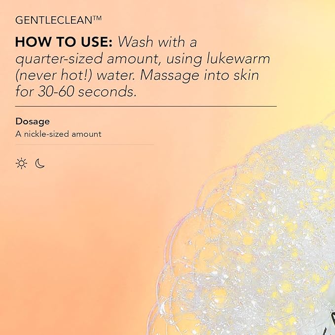 - How To Use - Wet face with lukewarm water (never hot!). Apply a quarter-sized amount to your wet palms. Lather well. Massage into skin for 30-60 seconds. Rinse off thoroughly with lukewarm water; pat dry. If you have makeup on, we recommend double-cleansing.