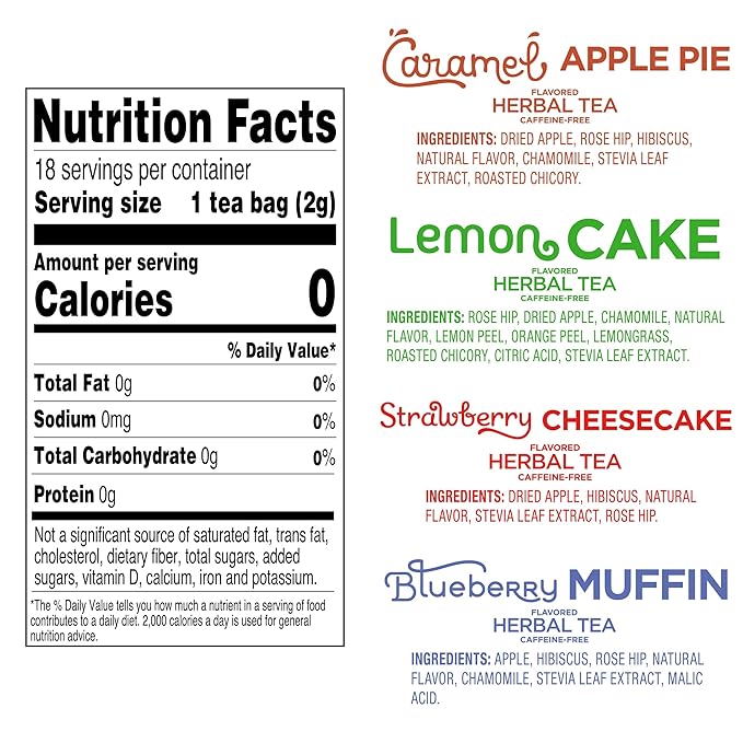 - BREWING YOUR TEA – Enjoy our dessert tea without having to worry about the ingredients. Our tea bags include herbal teas bursting with flavor, our new naturally flavored Sweet Temptations teas are deliciously rich and contain zero calories — the definition of guilt-free indulgence! Enjoy the full assortment of flavors!