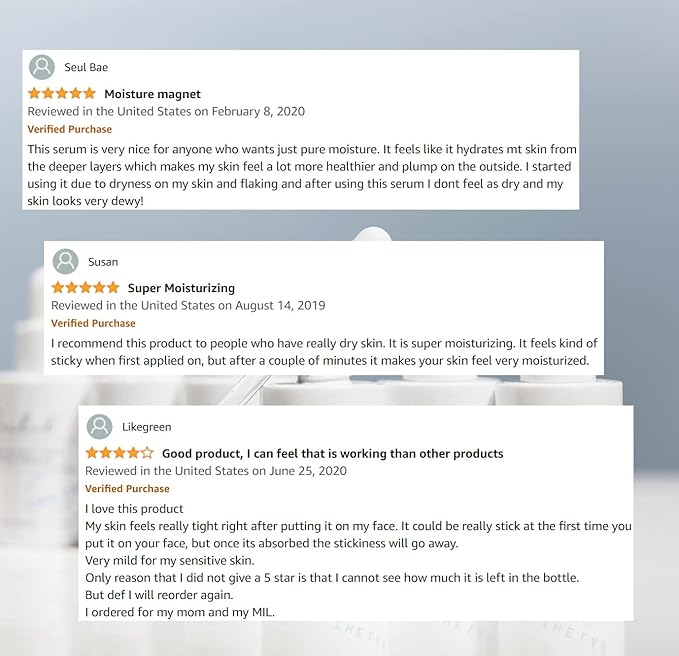 - ✔️ NATUALLY DERIVED HYALURONIC ACID: Moisturizes deeply from the bottom layer of the skin cells by attracting and holding moisture. The hyaluronic acid formula forms a hydrating layer which protects skin from irritation and dirt. The hydrating serum ampoule will deeply hydrate skin, revealing a youthful glow by stimulating cell regeneration and collage production. The signs of aging fine lines and s is going to be a thing of the past! The face serum will improve overall skin health.