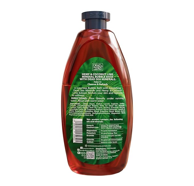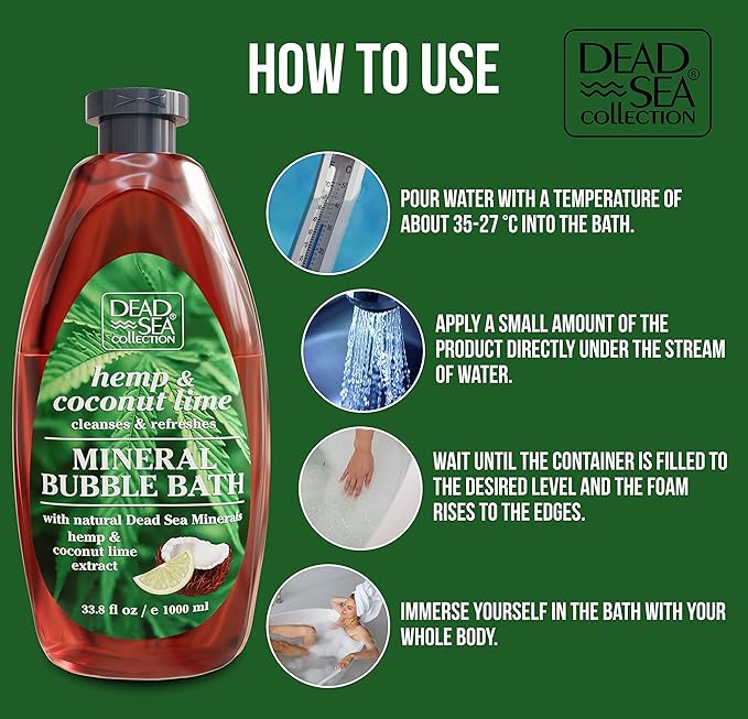 - Pure Dead Sea Minerals – Bring the Dead Sea treasures into the comfort of your home with this nourishing bubble bath bulk. It’s infused with real Hemp Seed Oil, Coconut Extract, Lime Extract and the Dead Sea Minerals that will keep your skin moisturized, refreshed & hydrated. Great for all skin types!