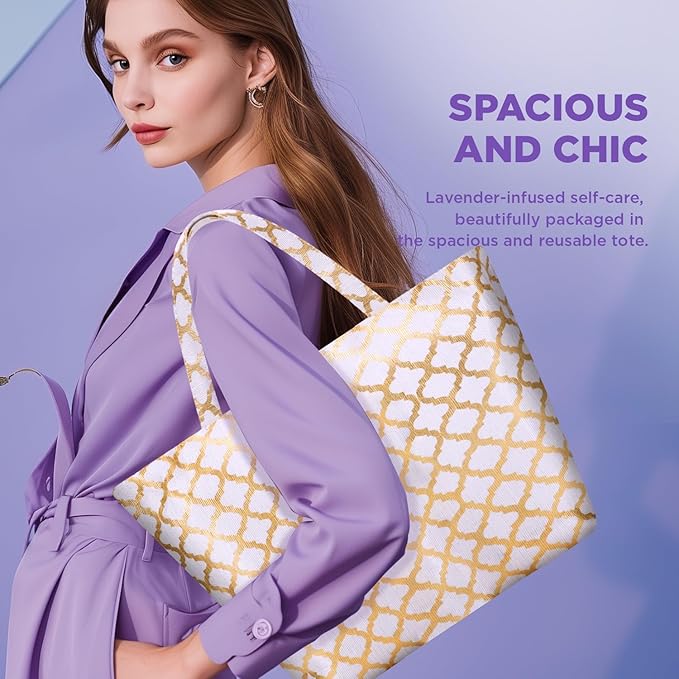 - [Pampering 15pc Home Bath Set] - Bathing with a fragrant and delightful assortment of luxury at-home spa products. Includes: Soap, Shampoo Bar, Lavender Massage Oil, 2pc Bath Bombs, Shower Gel, Bubble Bath, Body Lotion, Body Scrub, Bath Salt, Bath Puff, Body Brush, Hand Cream, Dry Hair Cap, Handmade Tote Bag.