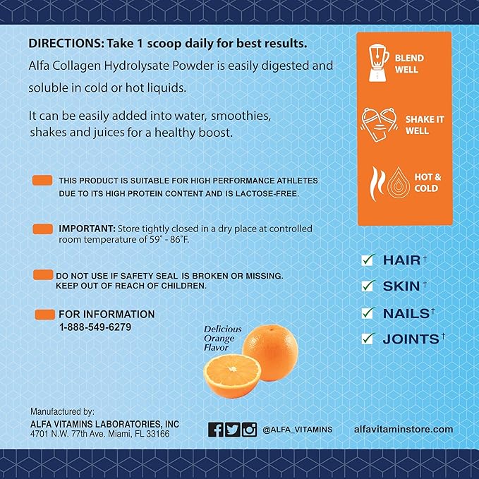 ALFA VITAMINS CollagenC Hydrolysate Peptides Powder Supplement with 1,000mg Vitamin C - Premium Quality Source of Nutrients - Skin, Hair, Nails, Immune Boost & Joints Support - Orange Flavor -11 OZ