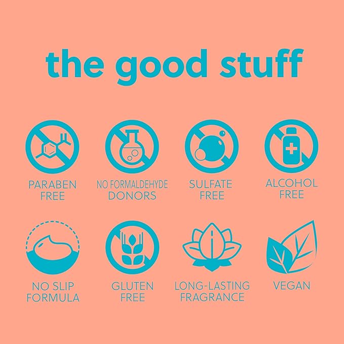 - Vegan, paraben free, sulfate free, alcohol free, no formaldehyde donors, has a no-slip formula and long-lasting fragrance