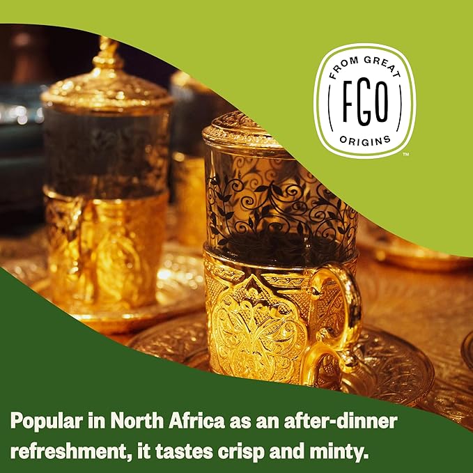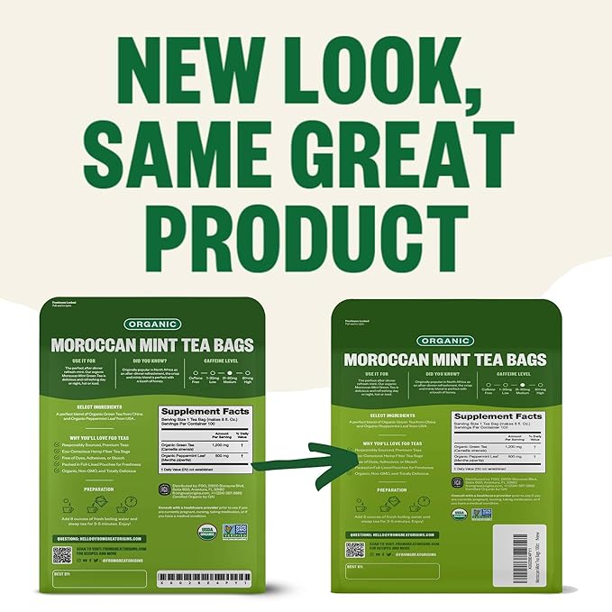 - MOROCCAN MINT GREEN TEA BAGS - 100 Tea Bags filled with a premium blend of green tea and peppermint.