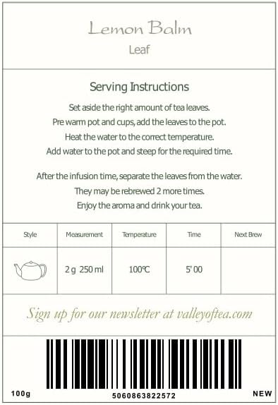 - All Valley of Tea products are grown, processed and packed by artisan tea makers, meaning you'll enjoy a superior lemon balm tea.