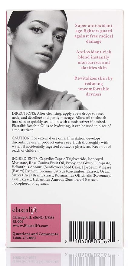 - Elastalift Rosehip Oil for face with Vitamin C and Cucumber. Pure Rosehip face oil helps with Wrinkles, Scarring, and Redness for a brighter skin complexion. 1.8 Fl Oz (Pack of 2)