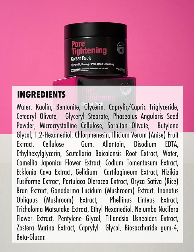 - Product Benefits : MEDITIME Pore Corset Pack brilliantly merges powerful components like Kaolin and Bentonite with enriching extracts like Red Bean powder and Amino Acids. This exceptional blend not only guarantees to proficiently minimize pores and manage sebum but also indulges your skin with essential moisture and gentle exfoliation. MEDITIME Pore Corset Pack brilliantly merges powerful components like Kaolin and Bentonite with enriching extracts like Red Bean powder and Amino Acids. This exceptional blend not o… See more