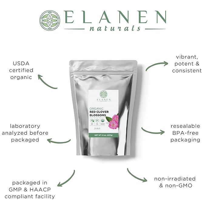 - USDA Certified Organic Red Clover: Our non-irradiated whole red clover flowers are non-GMO and organic sourced from organically certified growers, and our resealable packaging is always BPA-free.