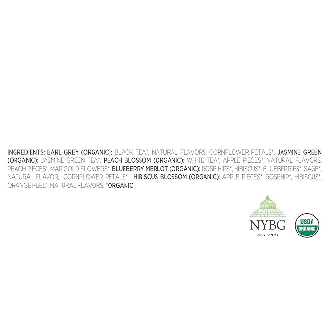 - TEA BLENDS - This tea collection includes 2 of each blend: Earl Grey (black tea), Jasmine Green (green tea), Peach Blossom (white tea), Blueberry Merlot (herbal tea), Hibiscus Blossom (herbal tea).