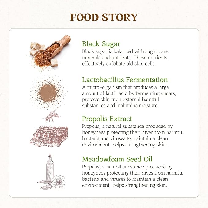 - Skinfood Honey Sugar Food Mask is a rich, nourishing wash-off mask that combines real black sugar and golden honey to exfoliate and moisturize in one sweet step. The gentle sugar crystals buff away dead skin cells while honey deeply hydrates skin.