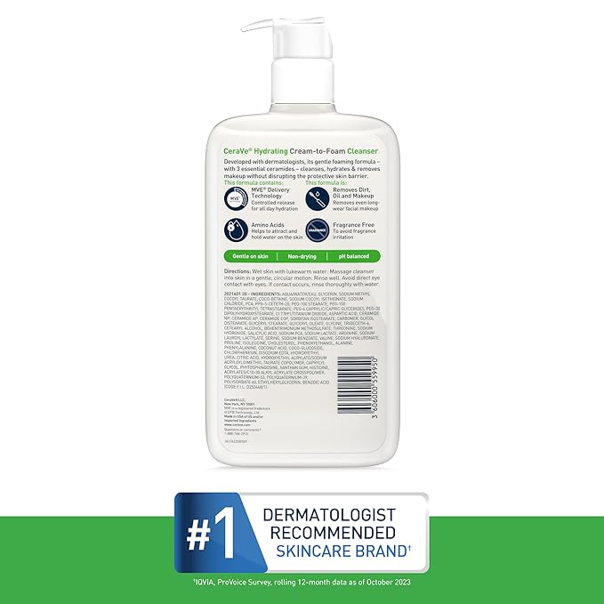 - [ CREAM TO FOAM HYDRATING CLEANSER ] Moisturizing face wash dispenses as a rich cream and transforms into a foam as you lather into skin. Non-drying formula, thoroughly cleanses without stripping skin of moisture or leaving a tight, dry feeling.