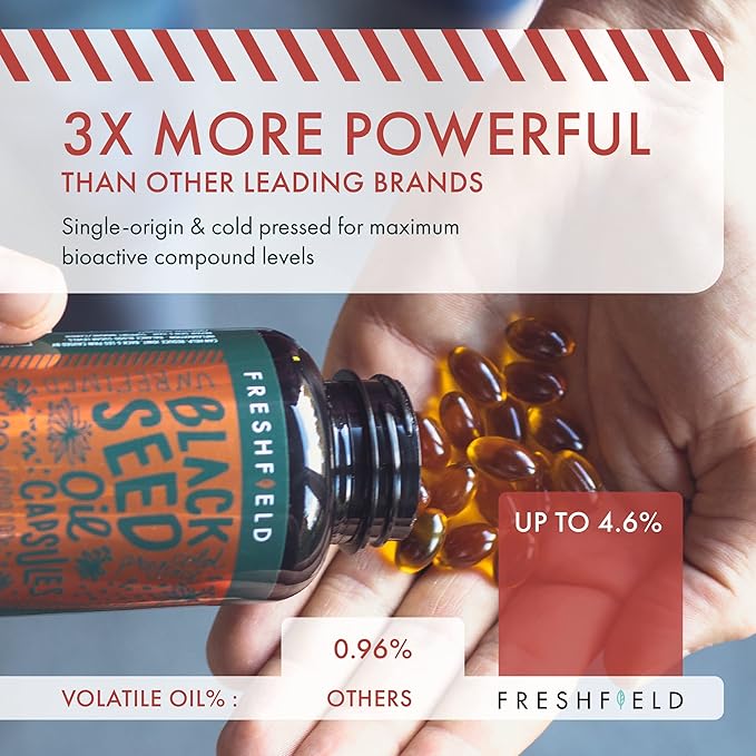 Freshfield Black Seed Oil: Up to 3X The Thymoquinone, Premium (Black Cumin Seed Oil, Nigella Sativa) | Cold Pressed | Vegan | Ultra Strength | Pure and 100% Natural. (120 Capsules)