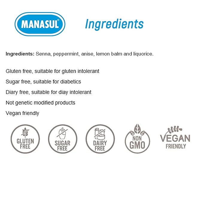 - 🌿 INGREDIENTS: Manasul classic is a laxative infusion which regulates normal intestinal transit. This Herbal tea is based on senna, Peppermint, Lemon Balm, liquorice and anise, all of organic origin. Our herbal teas are gluten free and doesn’t contain GMOs and traces.