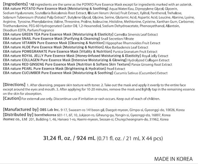 Eba nature} 44 Pcs Combo-Pack, Premium Korean Pure Essence Facial Mask Sheet (11 Types x 4 pcs), hydrating. moisturizing