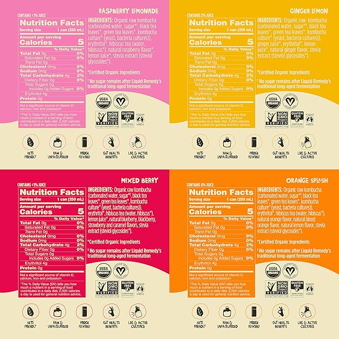 - Together in Gut-Lovin' Harmony: Work your way through our Fan Faves 4 Flavor Variety Pack with delicious flavors including sweet Raspberry Lemonade, zingy Ginger Lemon, fruity & floral Mixed Berry and tangy Orange Splash kombucha