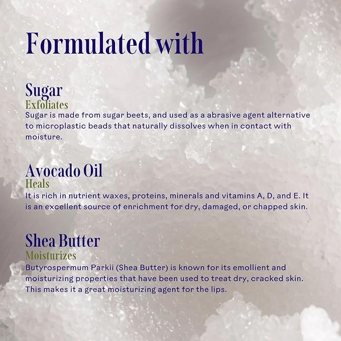 - INTENSIVE LIP MOISTURIZER: After the sugar flakes in this hydrating lip polish have removed dead, peeling skin, Avocado Oil is able to penetrate more deeply, smoothing and replenishing moisture, while Shea Butter is soothing to lips in need of repair.