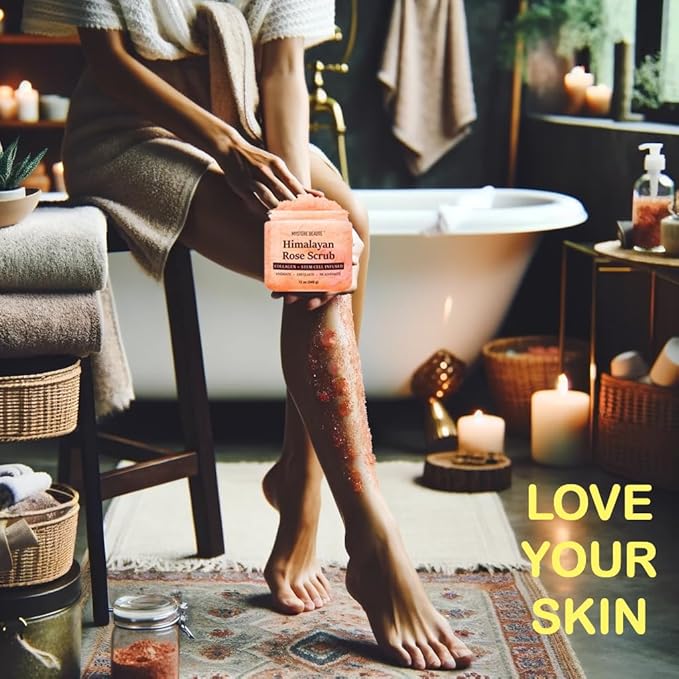 - A Massage of Roses - Mystere Beaute Pure Himalayan Pink Salt Scrub exfoliante para el cuerpo is formulated with powerful natural ingredients such as Rose Oil, Sweet Almond Oil, Lavender Oil and Coconut Oil. Rose Oil promotes an even skin tone and healthy complexion. Use as a body scrub, scalp scrub, hand scrub or foot scrub! Our Salt Scrub body scrub exfoliator Detoxifies & Hydrates skin while containing No Harmful Chemicals.