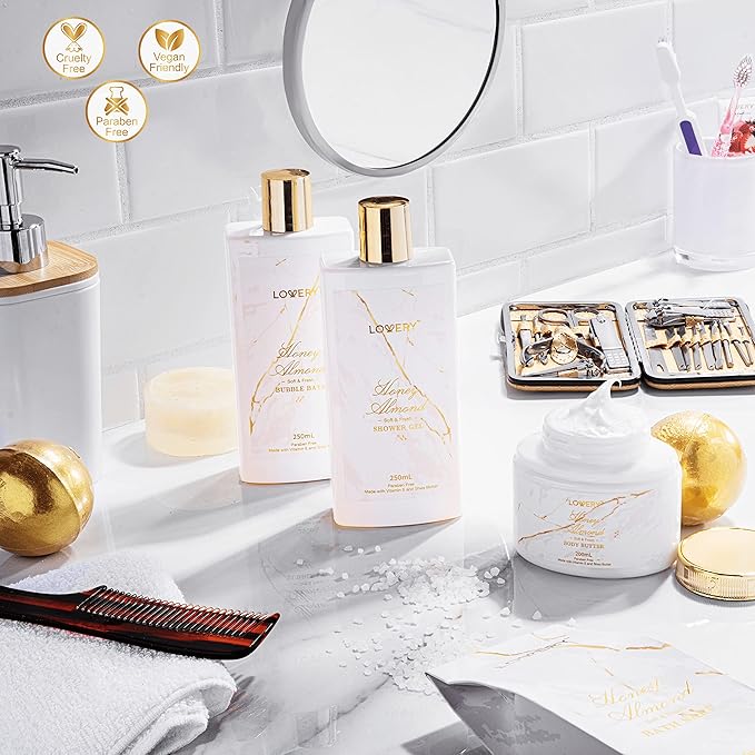 - HONEY ALMOND BEAUTY & PERSONAL CARE SET: This premium beauty & personal care package is infused with Almond Oil and Honey for an invigorating aromatherapy experience that is also one of the best things you can do for your skin! They are made with Natural Ingredients and is rich in Vitamin E and Shea Butter to protect and keep skin moisturized. Our Home Spa Basket is Paraben and Cruelty Free