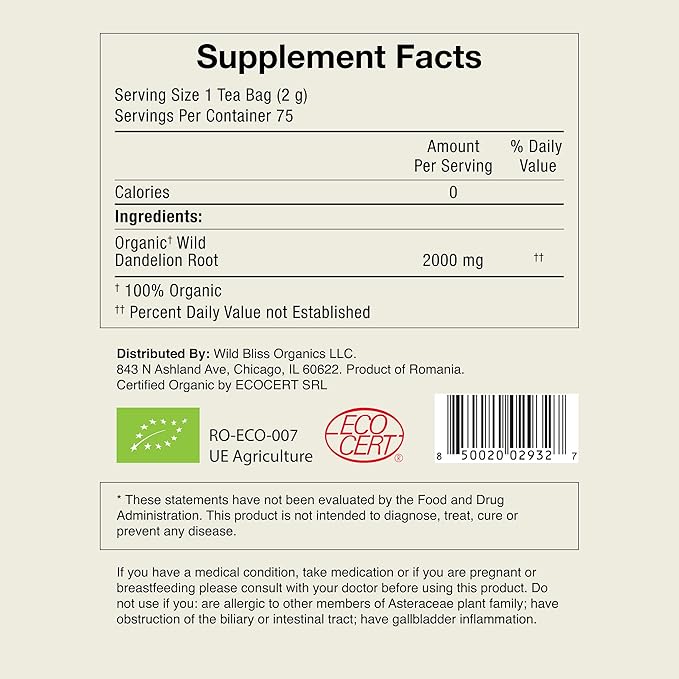 Wild Bliss Organic Wild Raw Dandelion Root Tea - Pharmacopoeia Quality Caffeine Free Herbal Detox Support - 75 Plant Based Tea Bags
