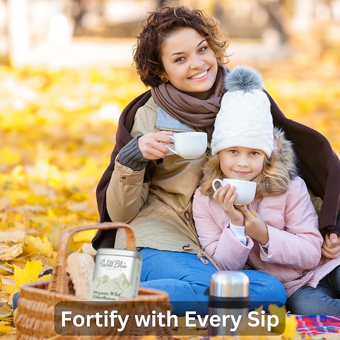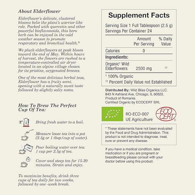Wild Bliss Organic Elderflower Herbal Tea - Caffeine Free Elder Flowers Tisane - Pharmacopoeia Potency - 20 Plant Based Tea Bags