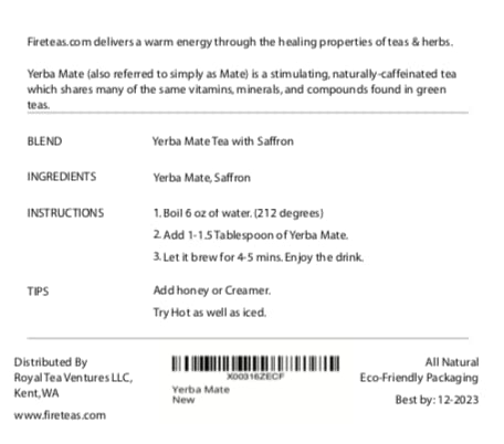 FIRE TEAS Yerba Mate Tea with Saffron threads - Loose Leaf, Caffeinated, Smooth Tasting -